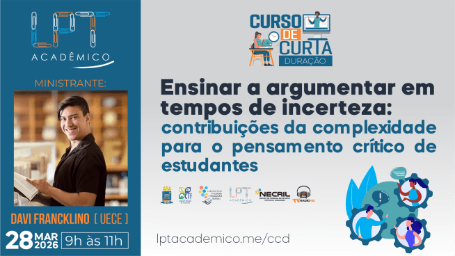 Estão abertas até 27 de março de 2026 as inscrições gratuitas para o curso on-line de curta duração Ensinar a argumentar em tempos de incerteza: contribuições da complexidade para o pensamento crítico de estudantes promovido pelo projeto de extensão LPT Acadêmico do Laboratório de Leitura e Produção Textual [LPT/CNPq] do Colégio Técnico de Floriano [UFPI], em parceria com Núcleo de Pesquisa em Estudos Críticos e Linguagem [NECriL] e a Pró-Reitoria de Extensão e Cultura [PREXC/UFPI].