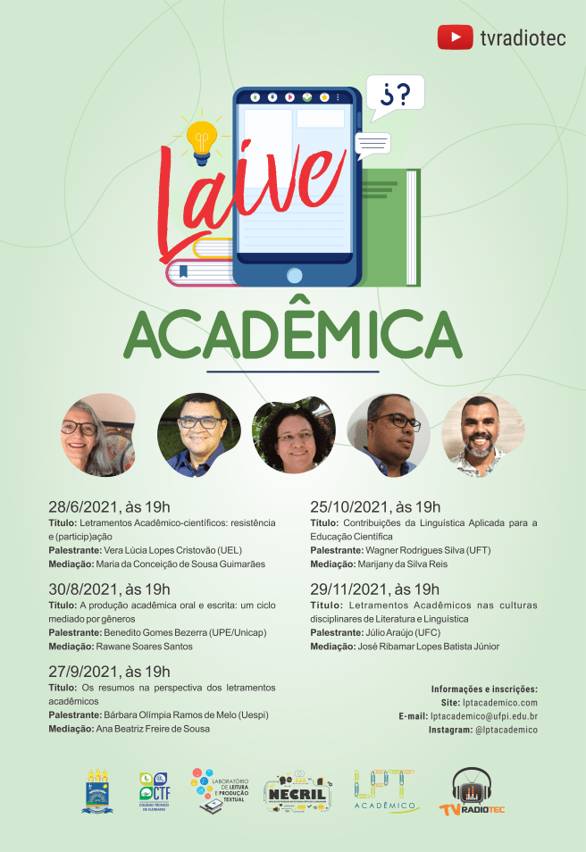 Estão abertas as inscrições gratuitas para a primeira edição do Laive Acadêmica – Ciclo de Palestras, uma iniciativa do projeto de extensão LPT Acadêmico do Laboratório de Leitura e Produção Textual (LPT/CNPq) do Colégio Técnico de Floriano (CTF/UFPI). A atividade conta com apoio da Pró-Reitoria de Extensão e Cultura (PREXC) e será realizada de forma on-line, no canal da TV Radiotec no YouTube.