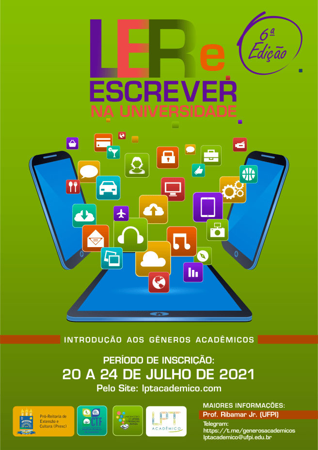 Estão abertas as inscrições para 5ª edição do curso de extensão on-line e gratuito do Laboratório de Leitura e Produção Textual (Colégio Técnico de Floriano/UFPI), por meio do projeto LPT Acadêmico e da Pró-Reitoria de Extensão e Cultura: Ler e escrever na universidade – introdução aos gêneros acadêmicos.