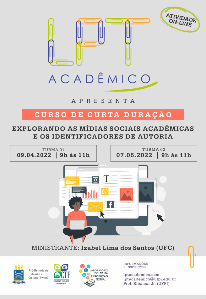Estão abertas as inscrições gratuitas para o curso on-line de curta duração Explorando as mídias sociais acadêmicas e os identificadores de autoria promovido pelo projeto de extensão LPT Acadêmico do Laboratório de Leitura e Produção Textual (Colégio Técnico de Floriano/UFPI), em parceria com a Pró-Reitoria de Extensão e Cultura (PREXC/UFPI) e Núcleo de Pesquisa em Estudos Críticos e Linguagem.
