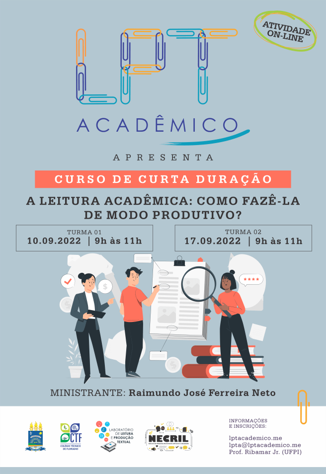 Estão abertas as inscrições gratuitas para o curso on-line de curta duração A leitura acadêmica: como fazê-la de modo produtivo? promovido pelo projeto de extensão LPT Acadêmico do Laboratório de Leitura e Produção Textual (Colégio Técnico de Floriano/UFPI), em parceria com a Pró-Reitoria de Extensão e Cultura (PREXC/UFPI) e Núcleo de Pesquisa em Estudos Críticos e Linguagem.