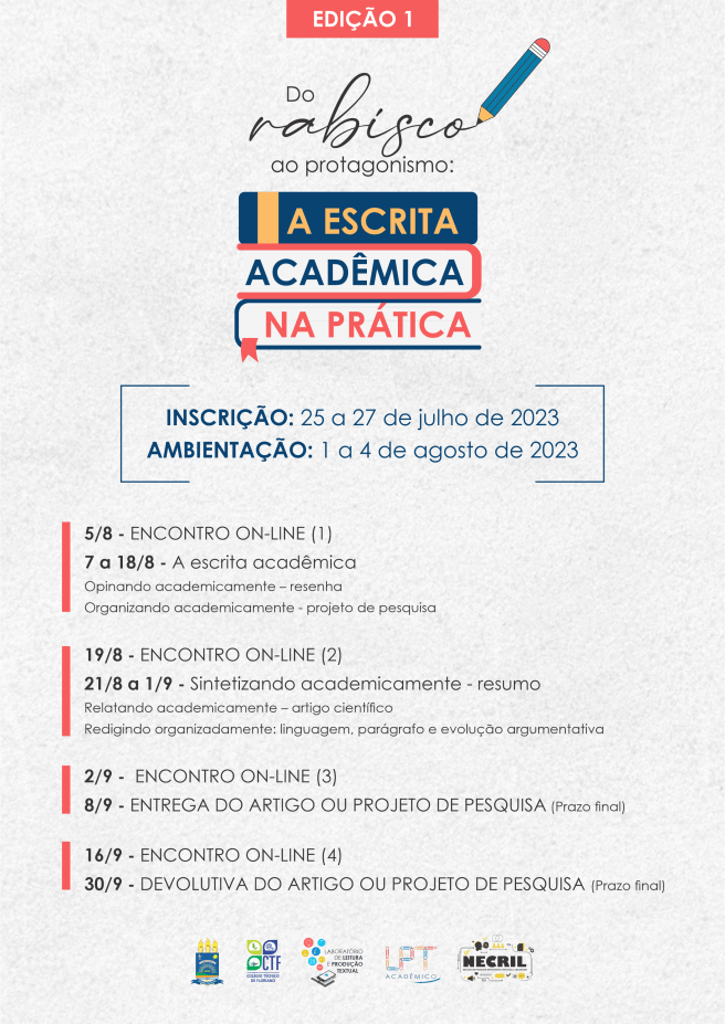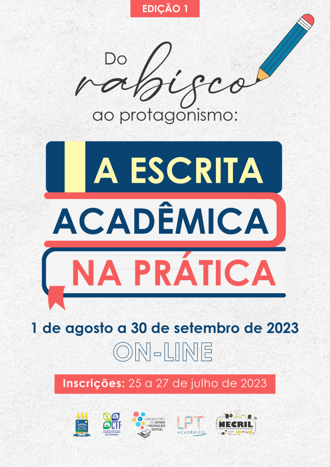 Estão abertas até o dia 27 de julho de 2023 as inscrições para a 1ª edição do curso de extensão on-line e gratuito DO RABISCO AO PROTAGONISMO: A ESCRITA ACADÊMICA NA PRÁTICA. O curso tem organização do Laboratório de Leitura e Produção Textual [LPT/CNPq] do Colégio Técnico de Floriano/UFPI, por meio do projeto LPT Acadêmico e do Núcleo de Pesquisa em Estudos Críticos e Linguagem [NECriL].