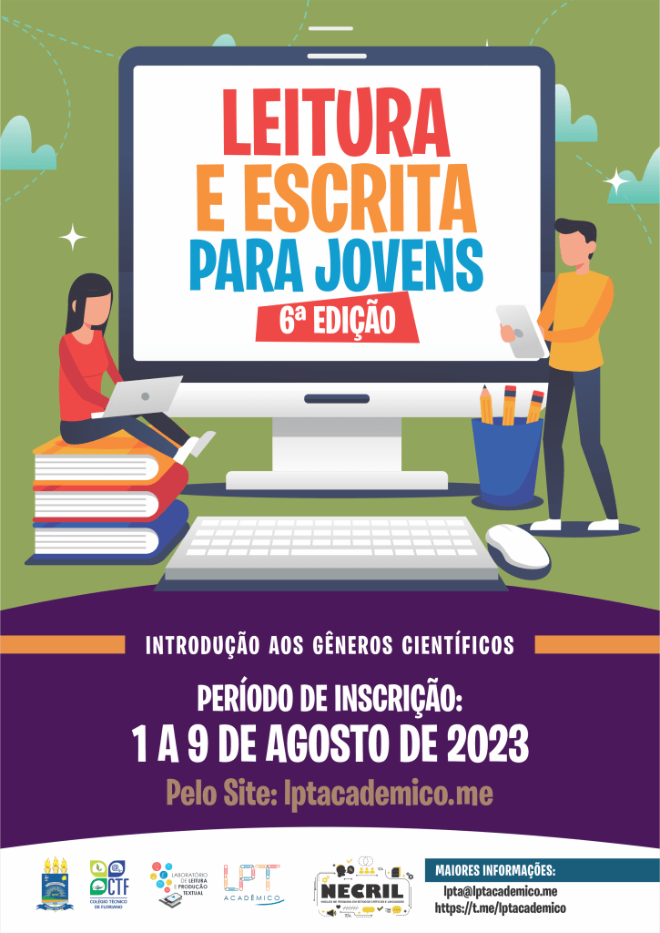 Estão abertas as inscrições para curso de extensão do Laboratório de Leitura e Produção Textual [Colégio Técnico de Floriano/UFPI], por meio do projeto de extensão LPT Acadêmico e da Pró-Reitoria de Extensão e Cultura: Leitura e escrita para jovens – introdução aos gêneros científicos. O curso acontecerá de forma on-line e a inscrição é gratuita.