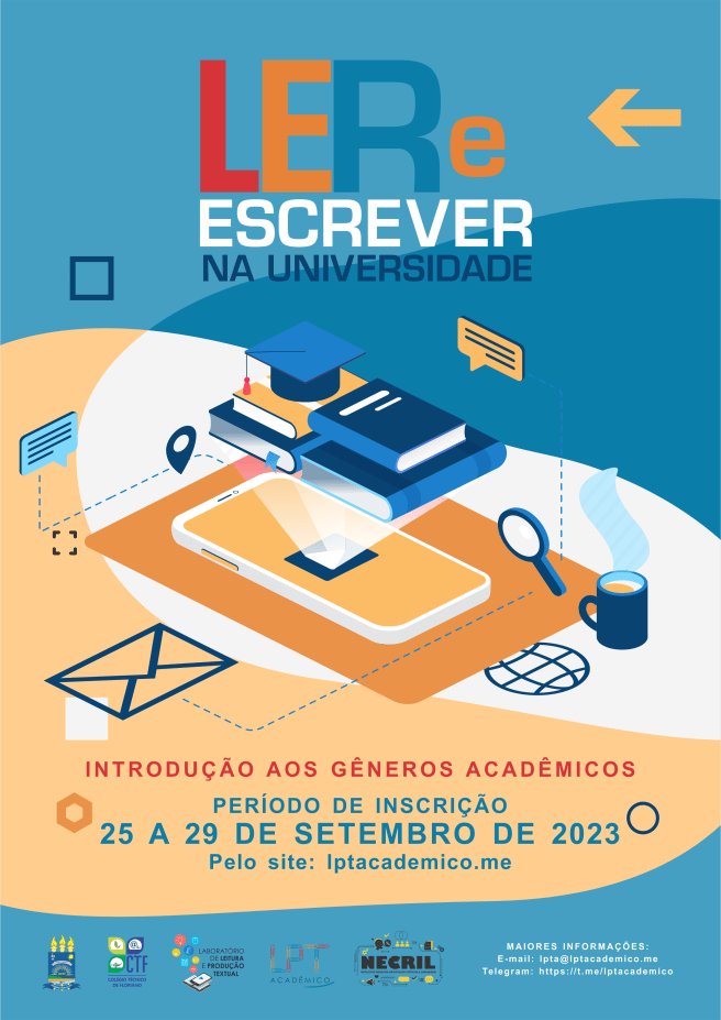 Estão abertas até 29 de setembro de 2023 as inscrições para 10ª edição do curso de extensão on-line e gratuito Ler e escrever na universidade: introdução aos gêneros acadêmicos. O curso tem organização do Laboratório de Leitura e Produção Textual [Colégio Técnico de Floriano/UFPI], por meio do projeto LPT Acadêmico e do Núcleo de Pesquisa em Estudos Críticos e Linguagem [NECriL].