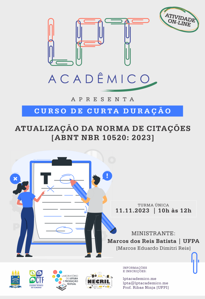 Estão abertas as inscrições gratuitas para o curso on-line de curta duração Atualização da norma de citações [ABNT NBR 10520: 2023] promovido pelo projeto de extensão LPT Acadêmico do Laboratório de Leitura e Produção Textual [Colégio Técnico de Floriano/UFPI], em parceria com Núcleo de Pesquisa em Estudos Críticos e Linguagem [NECriL] e a Pró-Reitoria de Extensão e Cultura [PREXC/UFPI].