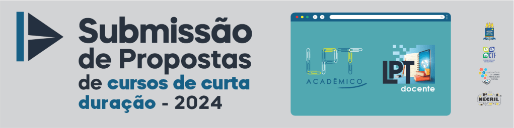 A Coordenação do LPT CONVIDA a comunidade acadêmica [docentes, técnicos e bolsistas do Colégio Técnico de Floriano; estudantes de graduação e pós-graduação da Universidade Federal do Piauí e de outras instituições públicas de ensino superior; membros do Núcleo de Pesquisas em Estudos Críticos e Linguagem [NECriL]; e parceiros do Laboratório de Leitura e Produção Textual – LPT/CNPq] a SUBMETEREM PROPOSTAS de cursos de curta duração a serem ministrados no ano de 2024, de forma gratuita e on-line, para os projetos LPT Acadêmico [escrita acadêmica/letramentos acadêmicos] e/ou LPT Docente [formação docente de Língua Portuguesa].