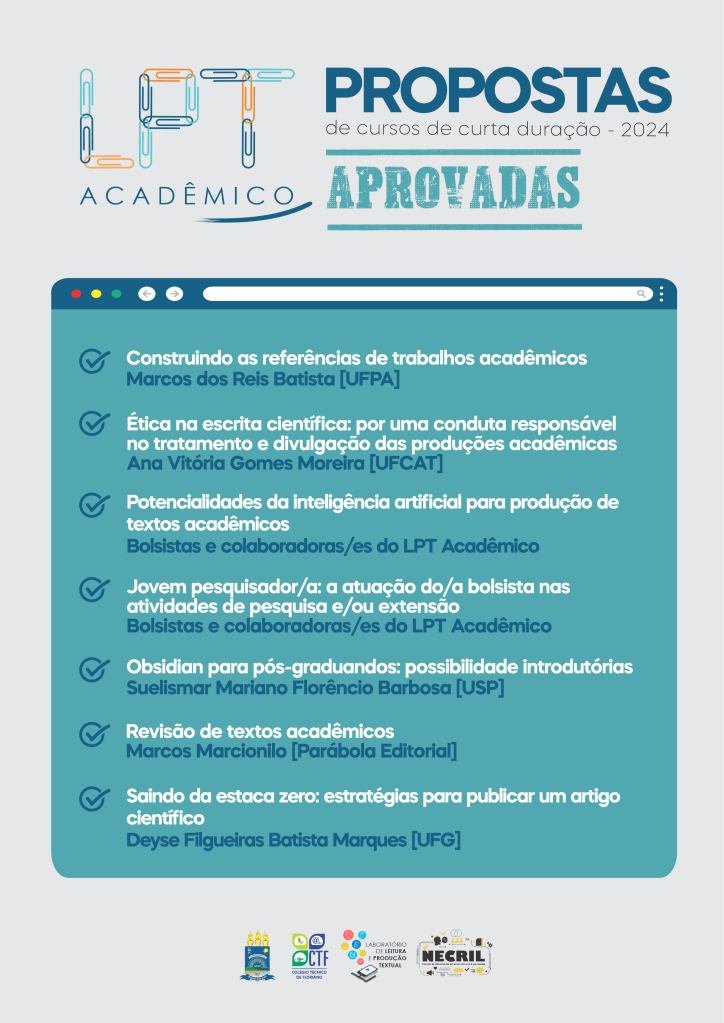 A Coordenação do LPT Acadêmico divulga o resultado da chamada para submissão de propostas de cursos de curta duração a serem ministrados no ano de 2024: