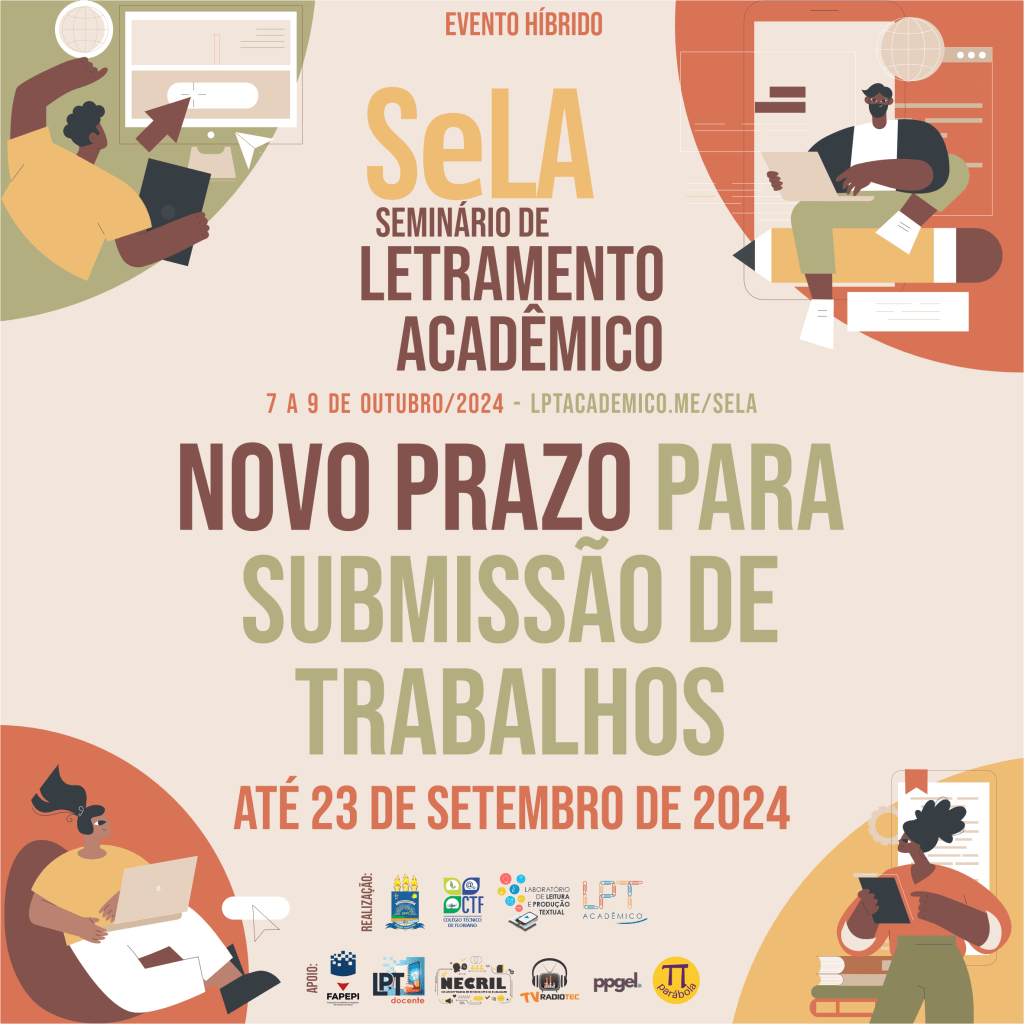 A Comissão Organizadora do Seminário de Letramento Acadêmico [SeLA] informa o adiamento do prazo para submissão de trabalhos para o evento até 23 de setembro de 2024.