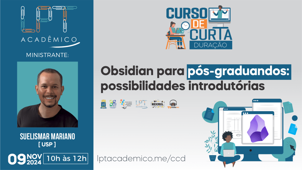 Estão abertas até 8 de novembro de 2024 as inscrições gratuitas para o curso on-line de curta duração Obsidian para pós-graduandos: possibilidades introdutórias promovido pelo projeto de extensão LPT Acadêmico do Laboratório de Leitura e Produção Textual [Colégio Técnico de Floriano/UFPI], em parceria com Núcleo de Pesquisa em Estudos Críticos e Linguagem [NECriL] e a Pró-Reitoria de Extensão e Cultura [PREXC/UFPI].