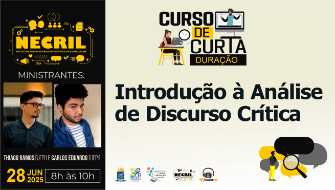 Estão abertas até 27 de junho de 2025 as inscrições gratuitas para o curso on-line de curta duração Introdução à Análise de Discurso Crítica promovido pelo Núcleo de Pesquisa em Estudos Críticos e Linguagem [NECriL] do Laboratório de Leitura e Produção Textual [LPT/CNPq] do Colégio Técnico de Floriano [UFPI], em parceria com os projetos de extensão LPT Acadêmico e LPT Docente e a Pró-Reitoria de Extensão e Cultura [PREXC/UFPI].
