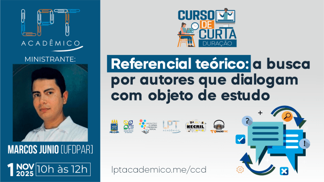 Estão abertas até 31 de outubro de 2025 as inscrições gratuitas para o curso on-line de curta duração Referencial teórico: a busca por autores que dialogam com objeto de estudo promovido pelo projeto de extensão LPT Acadêmico do Laboratório de Leitura e Produção Textual [LPT/CNPq] do Colégio Técnico de Floriano [UFPI], em parceria com Núcleo de Pesquisa em Estudos Críticos e Linguagem [NECriL] e a Pró-Reitoria de Extensão e Cultura [PREXC/UFPI].