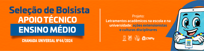 A Coordenação do Laboratório de Leitura e Produção Textual [LPT/CNPq] comunica que estão abertas as inscrições para processo seletivo de bolsista de apoio técnico [de nível ensino médio] para o projeto de pesquisa Letramentos acadêmicos na escola e na universidade: ações extensionistas e culturas disciplinares [Processo 420670/2025-4 – Chamada Universal CNPq Nº 44/2024]. Confiram o cronograma completo: