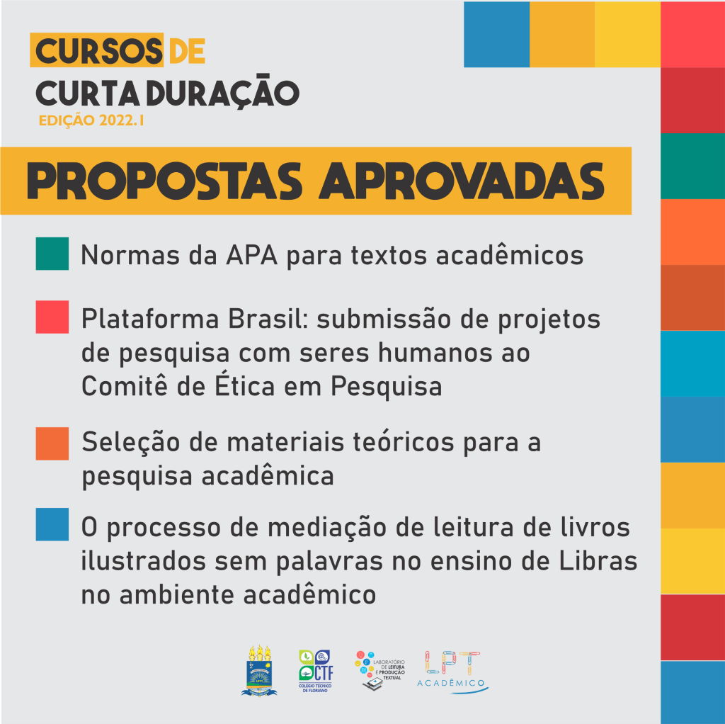 Estão abertas as inscrições gratuitas para o curso on-line de curta duração Seleção de materiais teóricos para a pesquisa acadêmica promovido pelo projeto de extensão LPT Acadêmico do Laboratório de Leitura e Produção Textual (Colégio Técnico de Floriano/UFPI), em parceria com a Pró-Reitoria de Extensão e Cultura (PREXC/UFPI) e Núcleo de Pesquisa em Estudos Críticos e Linguagem.