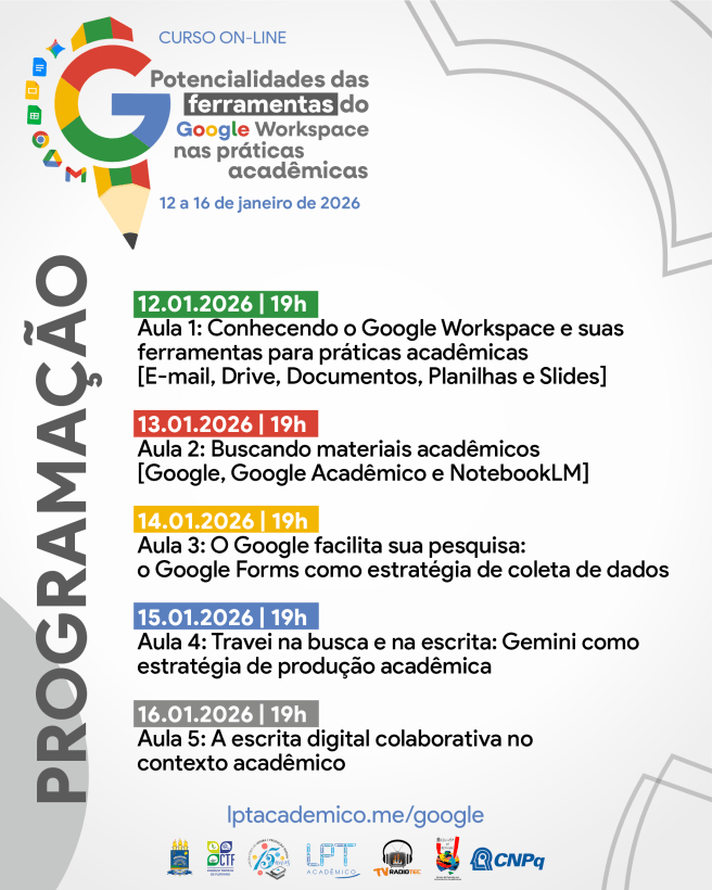 O curso on-line POTENCIALIDADES DAS FERRAMENTAS DO GOOGLE WORKSPACE NAS PRÁTICAS ACADÊMICAS é uma iniciativa do projeto LPT Acadêmico do Laboratório de Leitura e Produção Textual [LPT/CNPq] do Colégio Técnico de Floriano/UFPI, em parceria com o projeto Colcha de Retalhos, e pretende capacitar estudantes e professores a utilizar de forma estratégica as ferramentas do Google Workspace para otimizar suas atividades de pesquisa, escrita e colaboração. A metodologia do curso prevê a realização de aulas ao vivo, no canal da TV Radiotec no YouTube, com uma abordagem teórico-prática para otimizar a experiência de aprendizado.