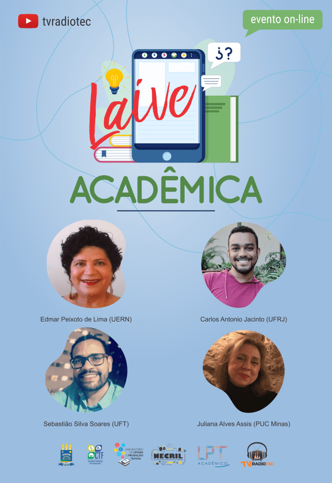 O Laboratório de Leitura e Produção Textual (LPT/CNPq), por meio do projeto de extensão LPT Acadêmico, tem a satisfação de anunciar a segunda edição da Laive Acadêmica, a serem realizadas on-line, no canal da TV Radiotec no YouTube, na última segunda-feira de cada mês, das 19h às 20h.